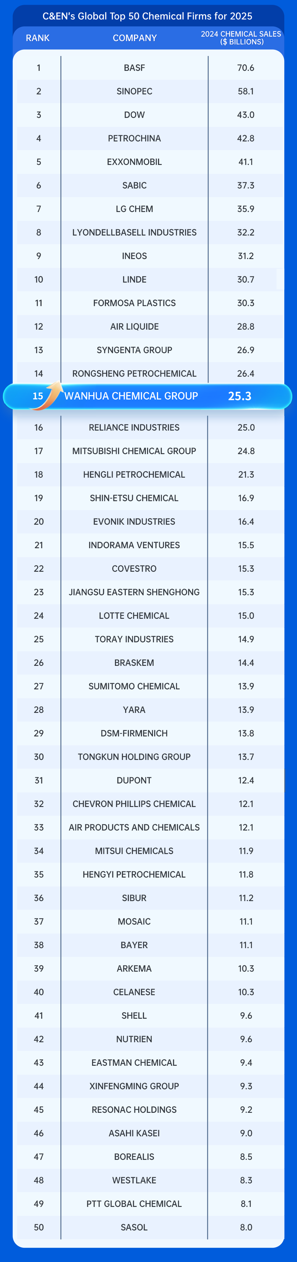 万华化学位列C&EN全球化工企业50强第15位!